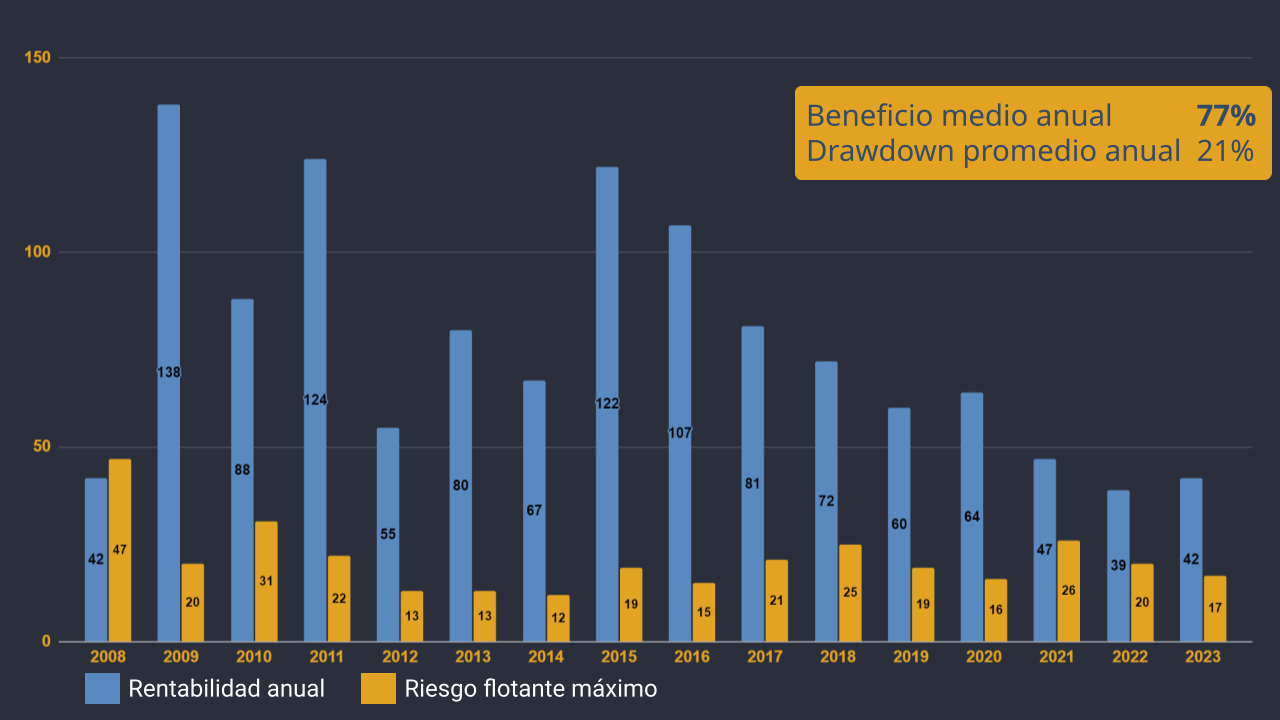 Los 7 algoritmos operan en pares de divisas con GBP, lo que hace que la rentabilidad máxima anual de esta cartera sea un 25% superior en años volátiles en comparación con carteras más pequeñas.