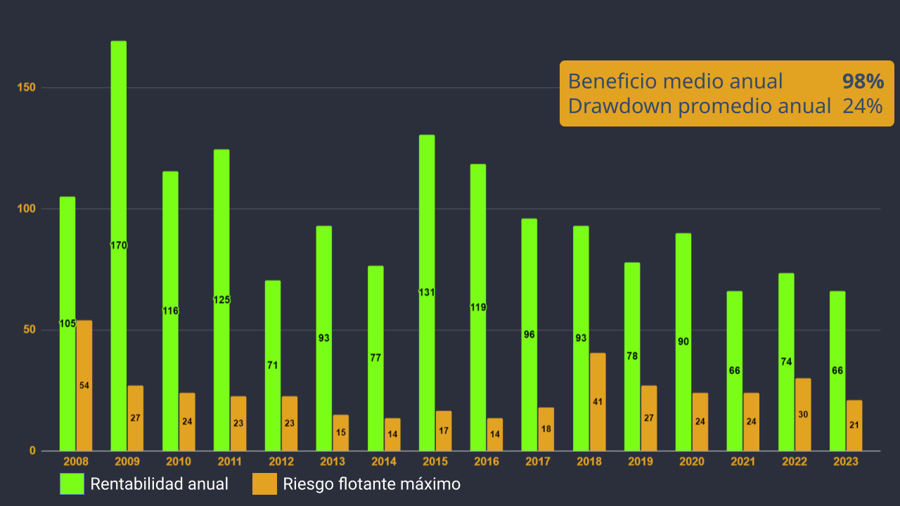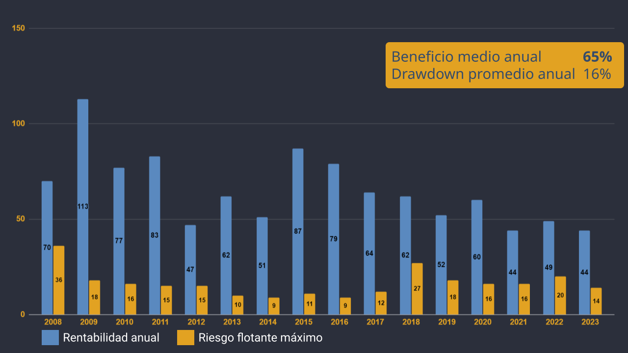 Este portafolio permite utilizar un multiplicador (aumento de los volúmenes de negociación) de x1,5 para aumentar la rentabilidad, ya que la detracción media anual en este caso no supera el 25% del capital.
